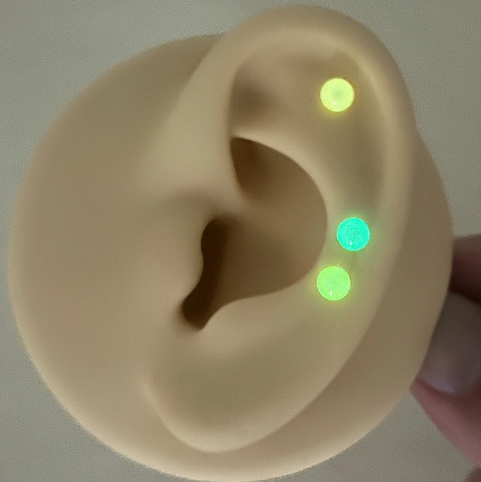 P/S* This is a luminous piercing. Place under the sun for a few minutes or illuminate it with the flashlight of your mobile phone or any flashlight for a few minutes. Next, put it in the dark and it will glow.