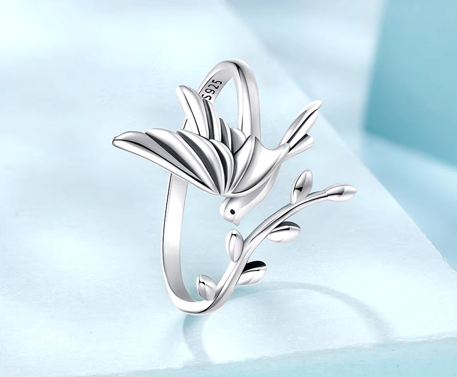 Classic 925 Sterling Silver Kingfisher Branch Landing Adjustable Ring (Size 7-9)