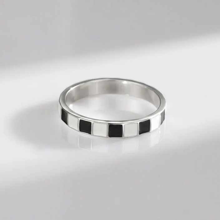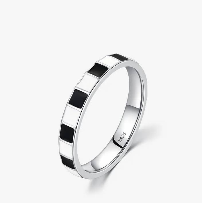 Elegant 925 Sterling Silver Black & White Checkers Ring