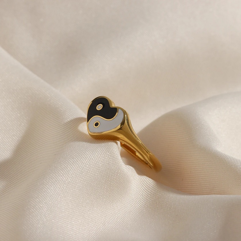 Elegant PVD-Stainless Steel Cute Heart Shape Enamel Yin Yang Ring