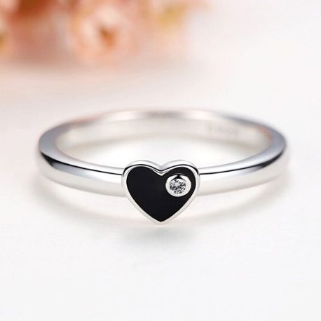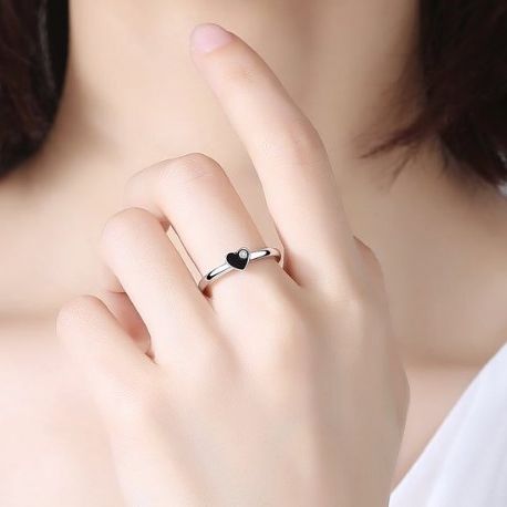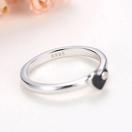 Exquisite 925 Sterling Silver Black Enamel Heart Zircon Ring